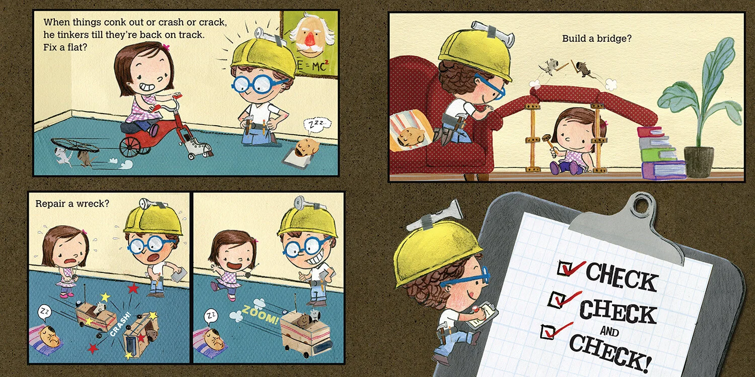 Rat-a-tat-tat! Make way for Joshua James and his tool belt and hard hat! In this lighthearted and innovative story, Joshua (aka Mr. Fix-It) tinkers with broken household items and manages a checklist on his clipboard. One day, he tries to concoct a mechanism that dumps his sister’s smelly diapers from the house into the outdoor garbage can. Once his plan is in place, the wheels start turning and the Fix-It Man is on the case. Two silly critters, assumed to be household pets, dillydally across each page either assisting the children or taking part in mischievous activities, which adds even more humor. Some of the content is displayed in comic book layout, along with some catchy onomatopoeia to grab readers’ attention. Joshua’s contraptions are each illustrated in a sequential order of lettered parts that could help children follow along with the mechanics of inventive construction. The children and animals are drawn with cartoonlike characteristics, such as oversize heads and squat legs, while watercolor and ink illustrations cover each spread. The subjects of brothers and sisters and apologies are explored as the story progresses, demonstrating what can go wrong when things don’t go as planned. VERDICT Pair with Andrea Beaty’s Ada Twist, Scientist for a terrific session on the trial and error of tinkering and problem-solving. A recommended general purchase. —Krista Welz, North Bergen High School, NJ