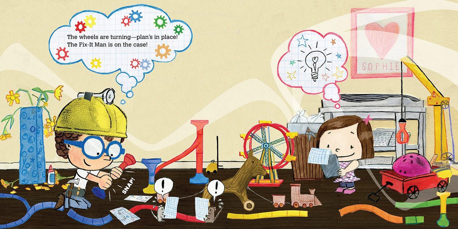 THE FIX-IT MAN An excellent example of illustrations (which show step-by-step Rube Goldberg machines) taking a story about a tinkering tot to greater heights. —Travis Jonker
